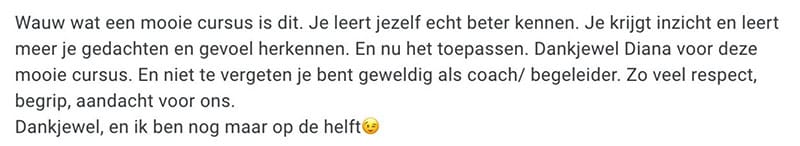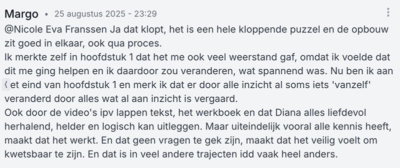 Ik begin te herkennen wanneer/waarom me iets raakt zodat ik nu kan kijken waar het vandaan komt. Werk nu aan het veranderen/shiften daarvan. En ik kom kilometers uit mijn comfort zone…